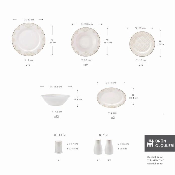 - بسته شامل 12 عدد بشقاب سرو 12 عدد بشقاب غذاخوری 12 عدد پیش دستی 12 عدد کاسه 2 عدد دیس کوچک 20 سانتی متر 1 عدد نمک پاش 1 عدد فلفل پاش 1 عدد نگهدارنده خلال دندان