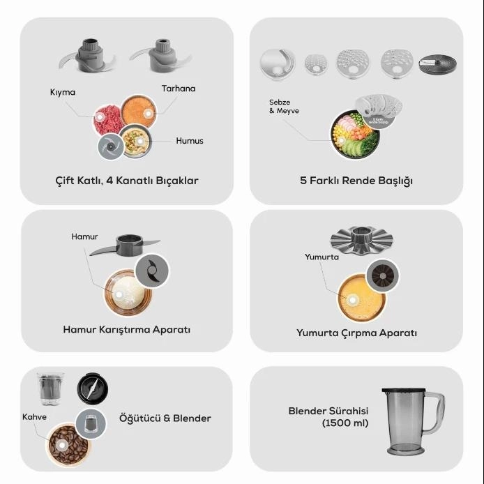 دارای عملکرد خرد کردن ، مخلوط کردن ، آسیاب کردن ، رنده کردن ، برش دادن ، ورز دادن و هم زدن ، خرد کردن یخ ، اسموتی سازتیغه های 4 عددی هلی کوپتری دو طبقه