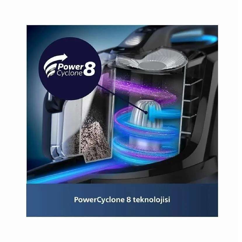 فناوری PowerCyclone 8 از یک حرکت چرخشی قدرتمند برای به حداکثر رساندن جریان هوا و ارائه بالاترین قدرت مکش استفاده می کند. جریان هوای فوق سریع در محفظه استوانه ای، گرد و غبار را با سرعت بیش از 185 کیلومتر در ساعت از هوا جدا می کند و قدرت مکش قوی تری را برای مدت طولانی تری برای نتایج تمیز کردن کامل فراهم می کند.