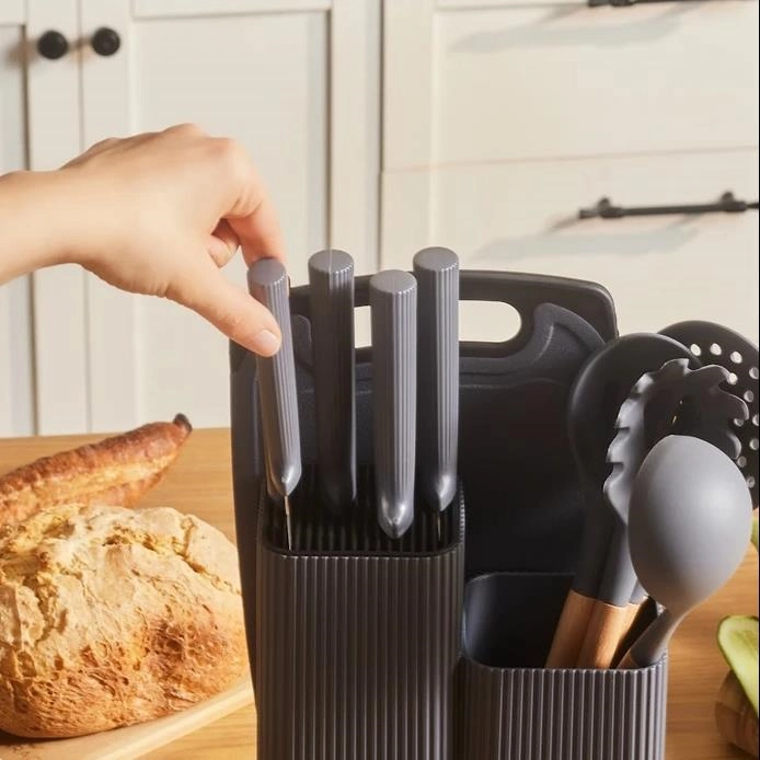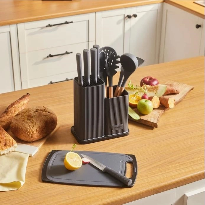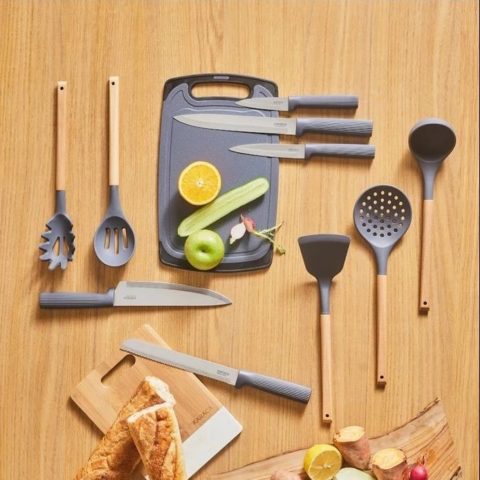 - بسته شامل 1 عدد چاقو پوست کن 19.5 سانتی متر 1 عدد چاقو سبزیجات 23.5 سانتی متر 1 عدد چاقو برش دادن 29 سانتی متر 1 عدد چاقو برش نان 31.8 سانتی متر 1 عدد چاقو سر آشپز 32 سانتی متر 1 عدد قاشق ماکارونی 32 سانتی متر 1 عدد قاشق آشپزی 32 سانتی متر 1 عدد ملاقه 32 سانتی متر 1 عدد کاردک 32 سانتی متر 1 عدد کفگیر 33 سانتی متر 1 عدد تخته برش 32.8×20×0.6 سانتی متر 1 عدد استند 23×13.2×21.5 سانتی متر