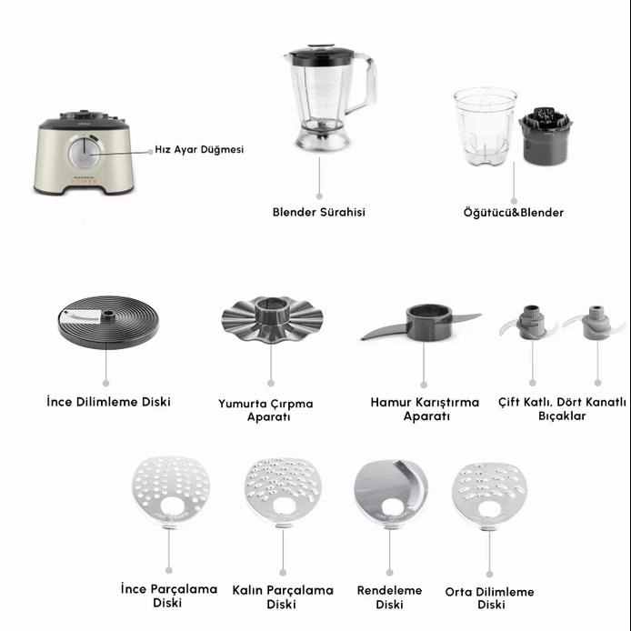 دارای عملکرد خرد کردن ، مخلوط کردن ، آسیاب کردن ، رنده کردن ، برش دادن ، ورز دادن و هم زدن ، خرد کردن یخ ، اسموتی سازتیغه های 4 عددی هلی کوپتری دو طبقه