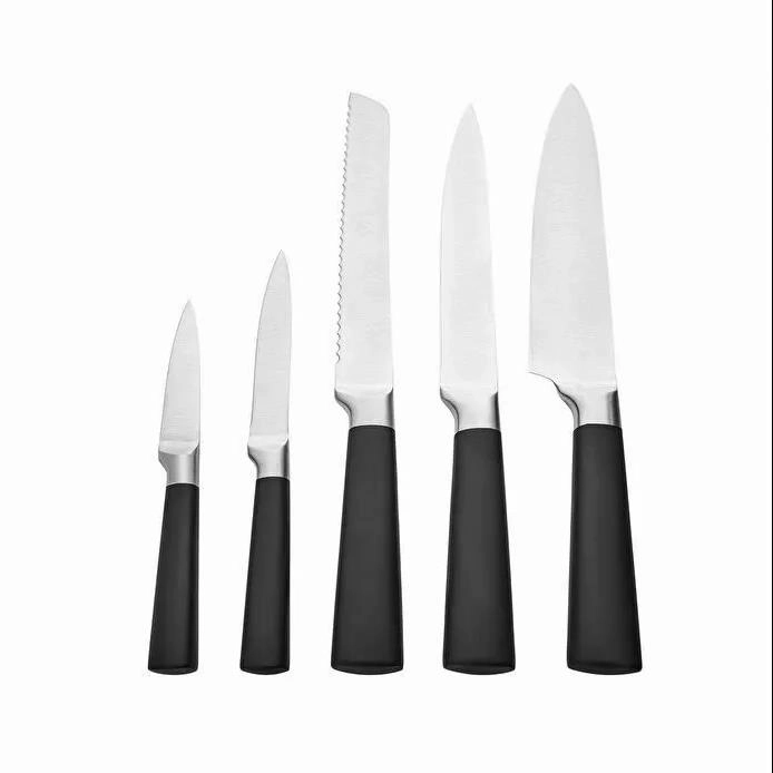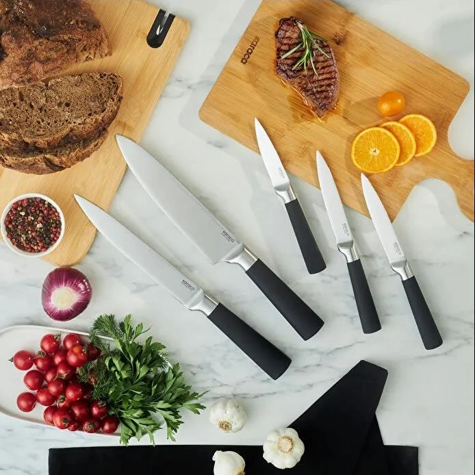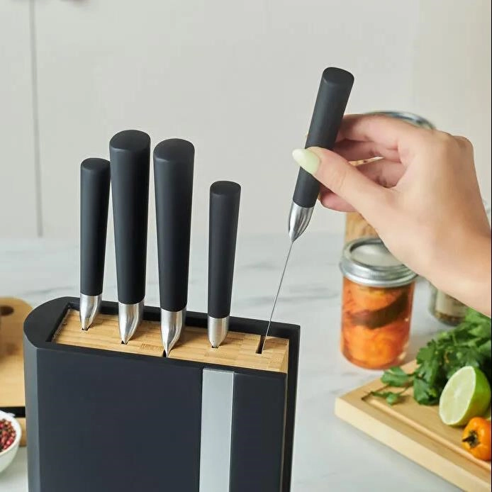 - بسته شامل 1 عدد چاقوی سرآشپز 33 سانتیمتر 1 عدد چاقوی برش، تیغه 33 سانتیمتر 2 عدد چاقوی سبزیجات 22.6 سانتیمتر 1 عدد چاقوی میوه خوری 20 سانتیمتر استند 21.5×6×23.5 سانتیمتر