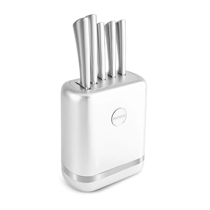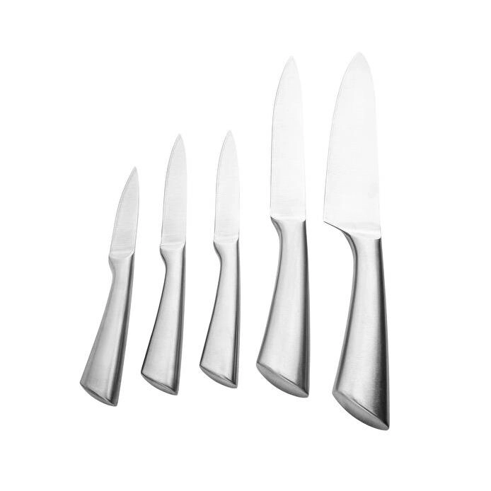 - بسته شامل 1 عدد چاقو سر آشپز 33.5 سانتی متر 1 عدد چاقو برش دادن 33.5 سانتی متر 2 عدد چاقو سبزیجات 23.5 سانتی متر 1 عدد چاقو پوست کن 20.3 سانتی متر 1 عدد استند 19.2 * 11.2* 22.5 سانتی متر