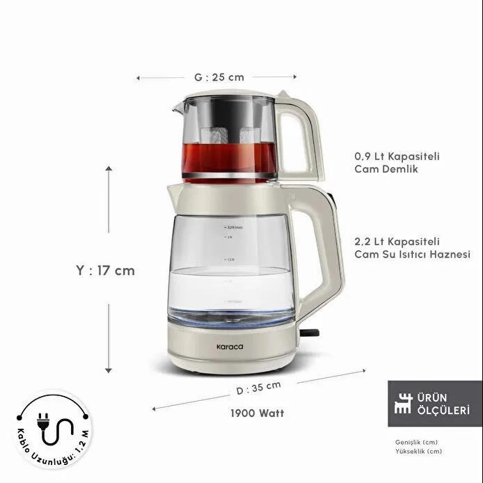 چای ساز شیشه ای Karaca Tea XL دارای قوری شیشه ای با ظرفیت 0.9 لیتر و کتری با ظرفیت 2.2 لیتر می باشد. به لطف ظرفیت XL آن، می توانید 35 فنجان چای را به یکباره دم کنید و چای خود را با خانواده و مهمانان خود میل کنید. به لطف ساختار شیشه ای قوری و مخزن آب، استفاده سالم و طولانی مدت را ارائه می دهد. به علاوه با شفافیتی که دارد به شما این امکان را می دهد که به راحتی میزان آب یا چای باقی مانده در آن را ببینید و در مواقع لزوم آن را تازه کنید با عملکرد گرم نگه داشتن خودکار خود در مصرف انرژی صرفه جویی می کندو آب را گرم نگه می داردبا پایه قابل چرخش 360 درجه، استفاده آسان را فراهم می کند.