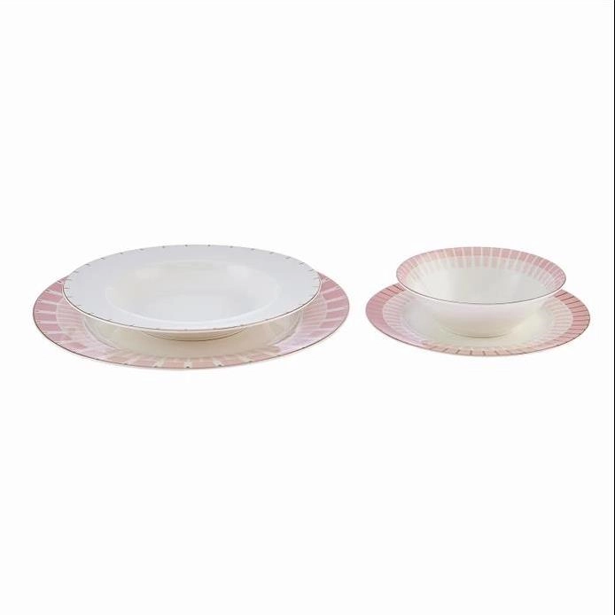 - بسته شامل 6 عدد بشقاب غذا خوری 27 سانتی 6 عدد خورش خوری 20 سانتی 6 عدد پیش دستی 20 سانتی 6 عدد کاسه 14 سانتی