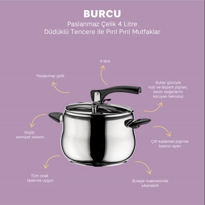 زودپز Emsan Burcu 4 Lt استیل ضد زنگ با 4 سایز مختلف دارای گزینه های مناسب برای بزرگ ترین خانواده ها و کوچک ترین خانواده ها می باشد.