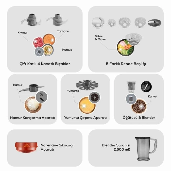 دارای عملکرد خرد کردن ، مخلوط کردن ، آسیاب کردن ، رنده کردن ، برش دادن ، ورز دادن و هم زدن ، خرد کردن یخ ، اسموتی ساز ،آب مرکبات گیری