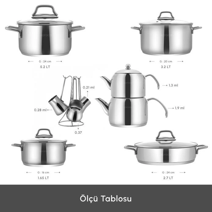 - بسته شامل یک عدد قابلمه عمیق قطر 20 سانتی متر همراه درب یک عدد قابلمه عمیق قطر 24 سانتی متر همراه درب یک عدد قابلمه عمیق قطر 16 سانتی متر همراه درب یک عدد نیم قابلمه قطر 24 سانتی متر همراه درب یک عدد قوری استیل 1.3 لیتر یک عدد کتری استیل 1.9 لیتر شیر جوش استیل سه عددی به همراه استند ( 210 - 280 - 370 میلی )