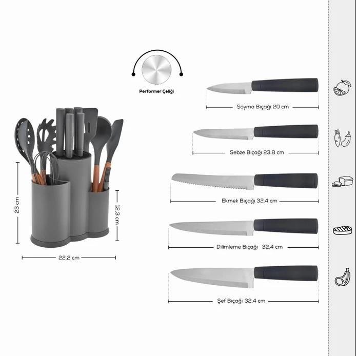 - بسته شامل 1 عدد چاقو سر آشپز 20 سانتی متر 1 عدد چاقو برش دادن 20 سانتی متر 1 عدد چاقو نان 20 سانتی متر 1 عدد چاقو خرد کردن 13 سانتی متر 1 عدد چاقو پوست کن 9 سانتی متر 1 عدد قاشق 1 عدد ملاقه 1 عدد چنگال ماکارونی 1 عدد کفگیر 1 عدد لیسک 1 عدد همزن 1 عدد فرچه به همراه استند