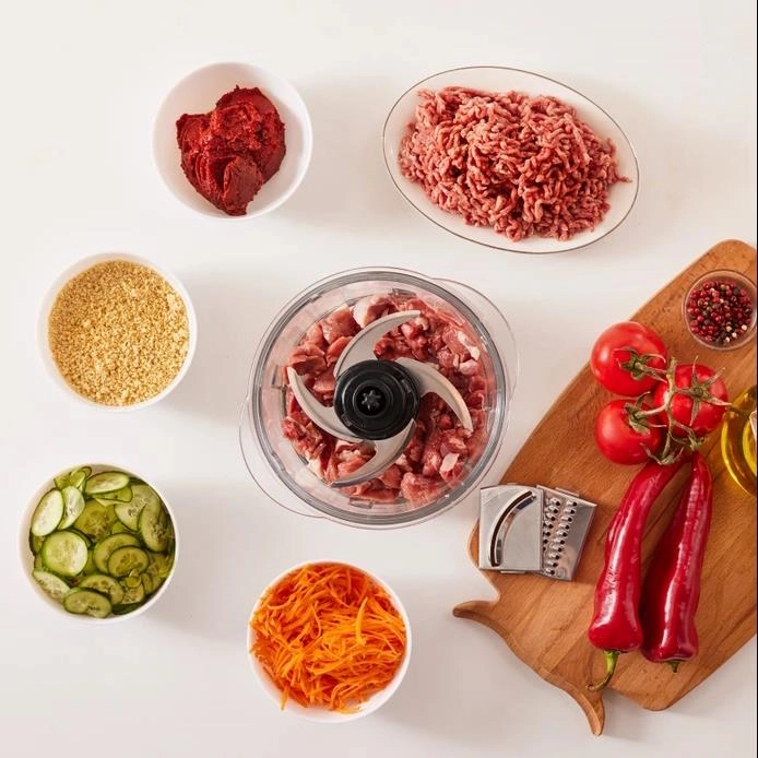 با ظرفیت 1.5 لیتری محفظه خردکن شیشه ای و ساختار تیغه 4 عددی دولایه، می توانید بدون زحمت غذاهایی مانند سبزیجات، گوشت و میوه ها را به مقدار دلخواه خرد کنید.