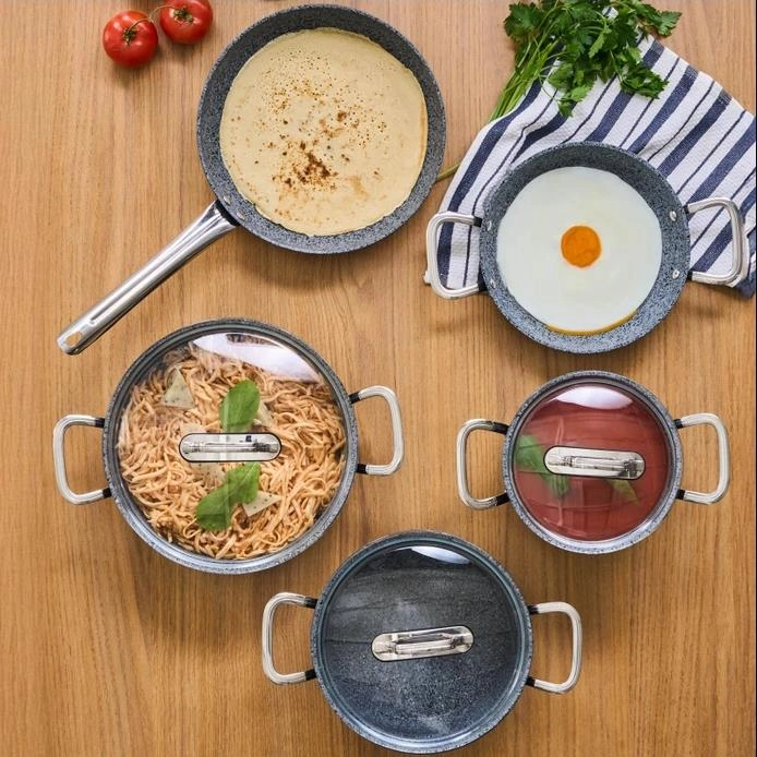 - بسته شامل یک عدد قابلمه عمیق قطر 18 سانتی متر همراه درب یک عدد قابلمه عمیق قطر 22 سانتی متر همراه درب یک نیم عدد قابلمه قطر 26 سانتی متر همراه درب یک عدد تابه قطر 26 سانتی متر یک عدد تابه قطر 22 سانتی متر