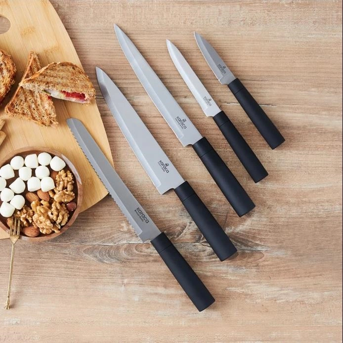 - بسته شامل 1 عدد چاقو سر آشپز 32 سانتی متر 1 عدد چاقو برش دادن 32 سانتی متر 1 عدد چاقو نان 32 سانتی متر 1 عدد چاقو چند منظوره 12 سانتی متر 1 عدد چاقو پوست کن 8 سانتی متر