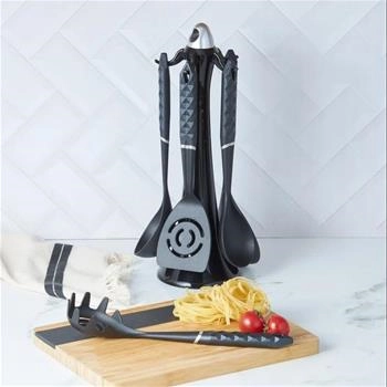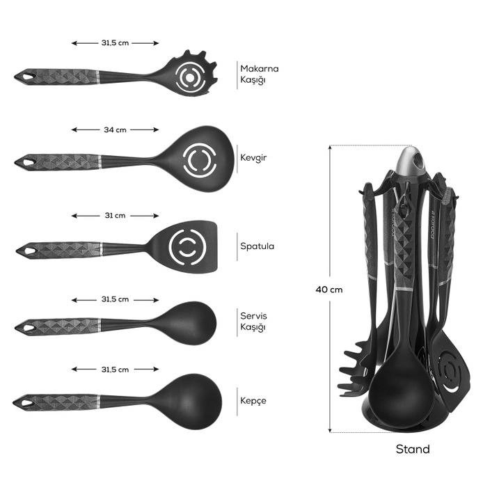 - بسته شامل ملاقه 31.5 سانتی متر قاشق 31.5 سانتی متر چنگال ماکارونی 31.5 سانتی متر کفگیر شکاف دار 31 سانتی متر کفگیر 34 سانتی متر استند