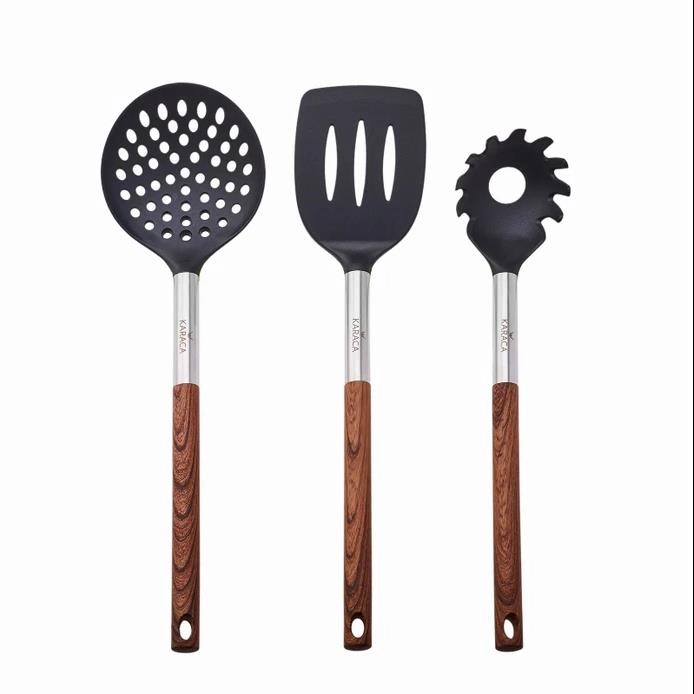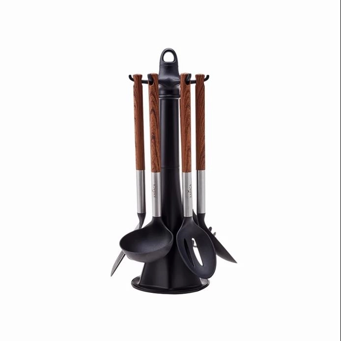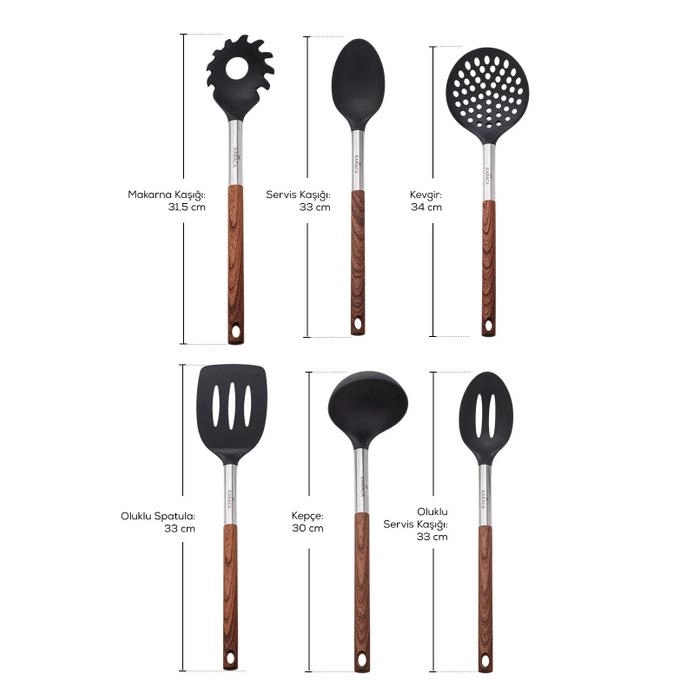 - بسته شامل قاشق 34 سانتیمتر ملاقه 30 سانتیمتر قاشق 33 سانتیمتر ملاقه 33 سانتیمتر کفگیر 33 سانتیمتر چنگال 31 سانتیمتر استند 42 × 16 سانتیمتر