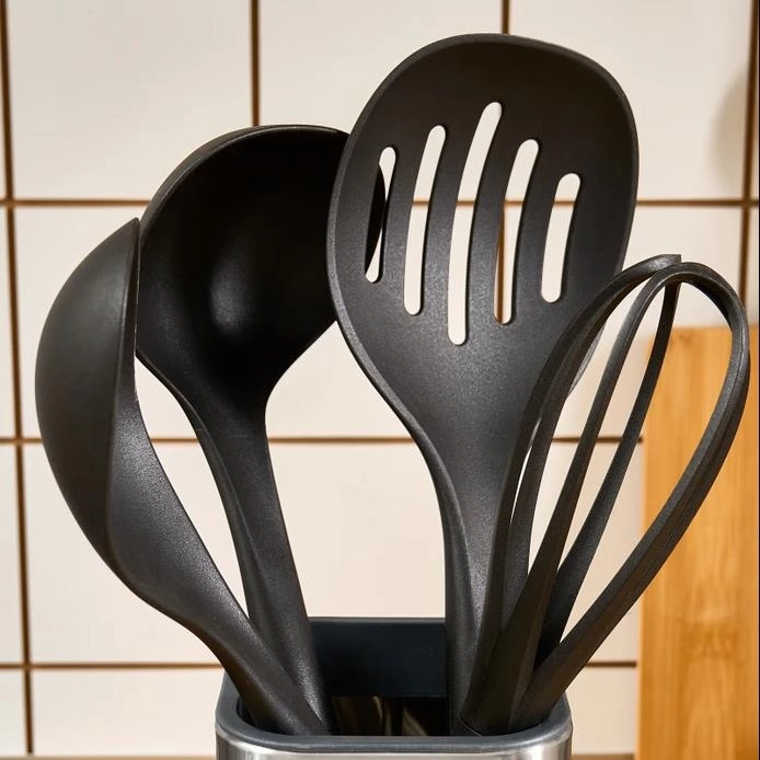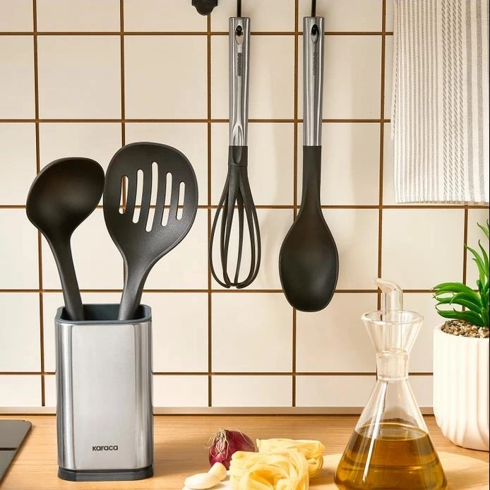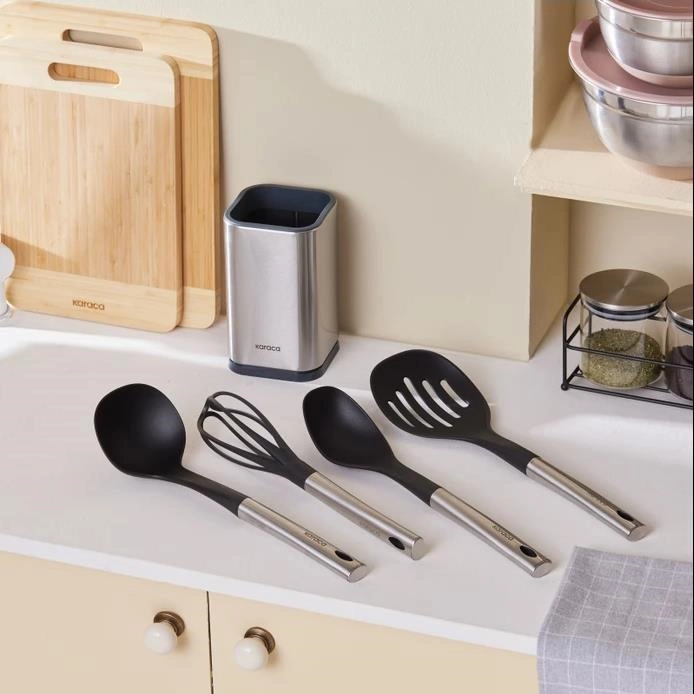 - بسته شامل ملاقه 33×9.5 سانتی متر قاشق آشپزخانه 34×7 سانتی متر کفگیر 35.5×11 سانتی متر همزن دستی استند استیل 430 دستگیره: استیل 410